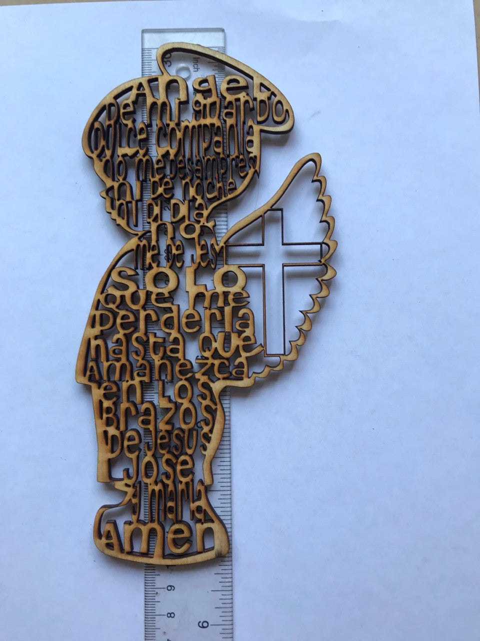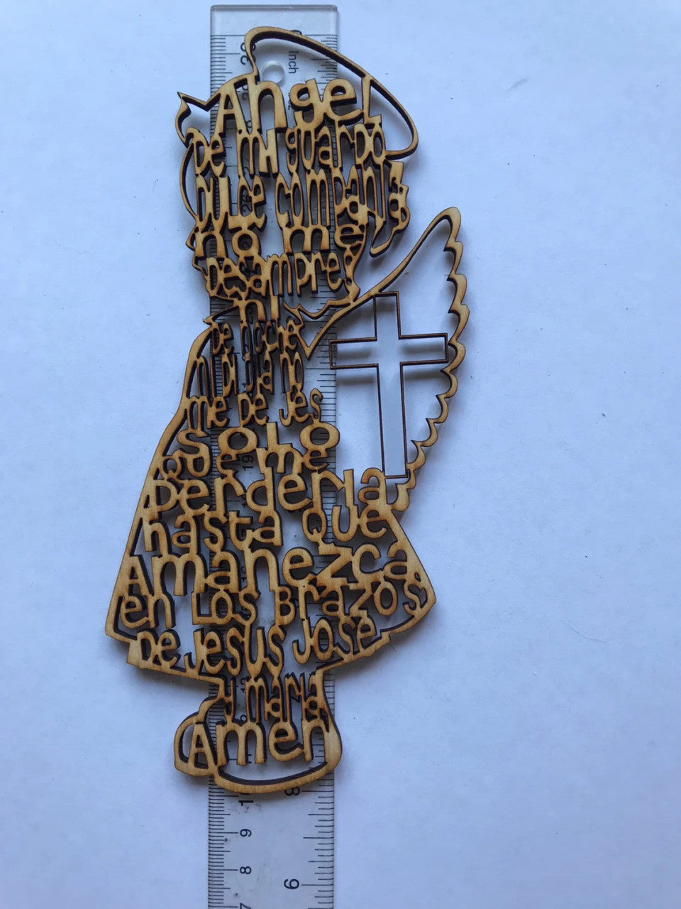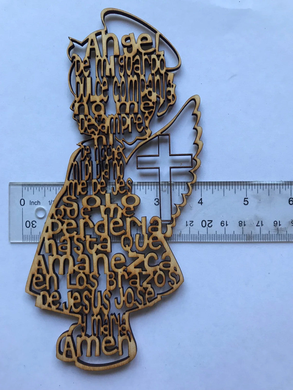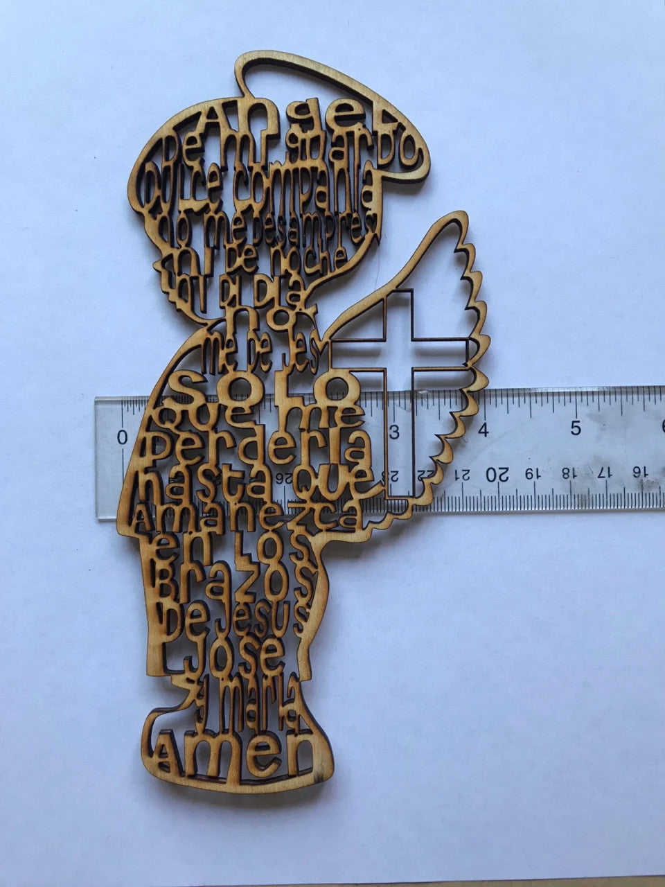 Angel with beautiful Spanish Prayer. Angel may shows some burn marks on back from laser cutting, it gives a nice rustic look!