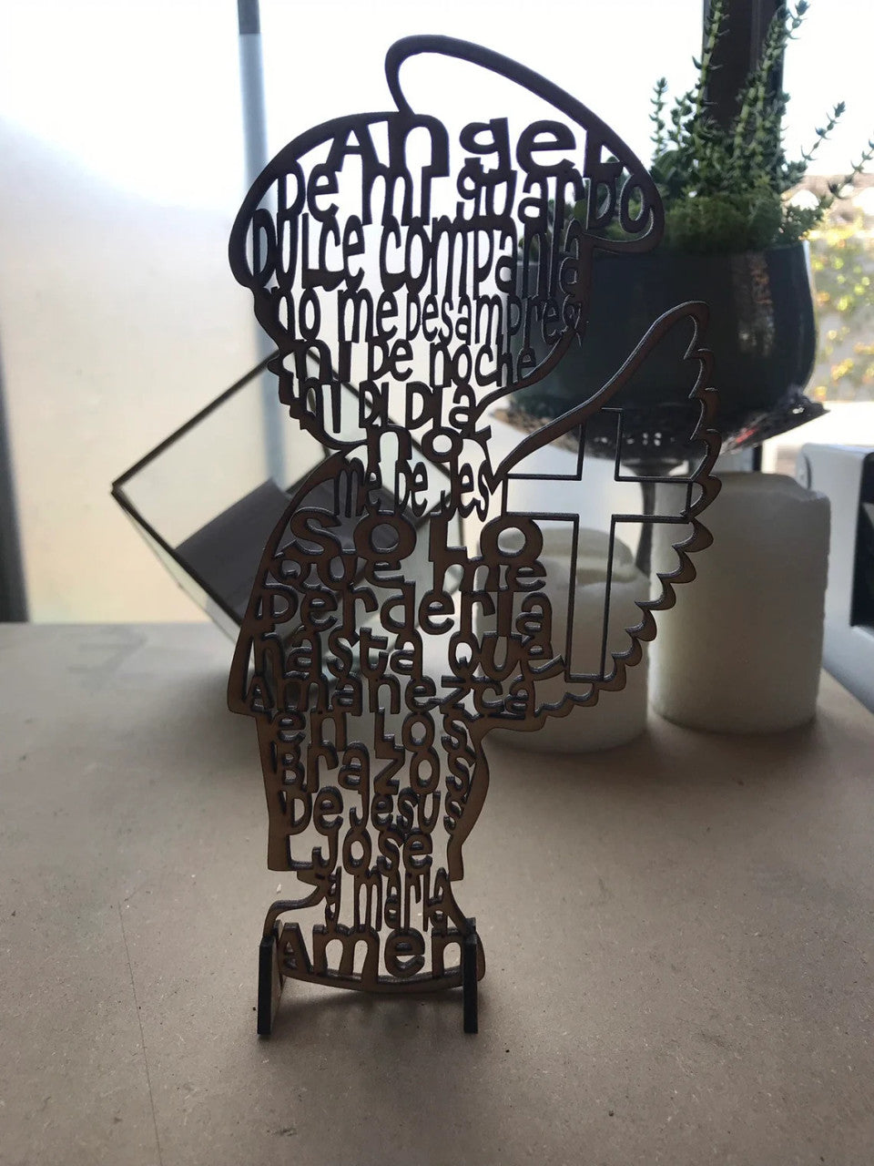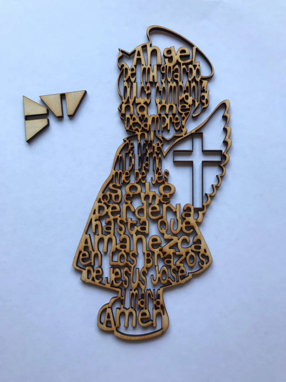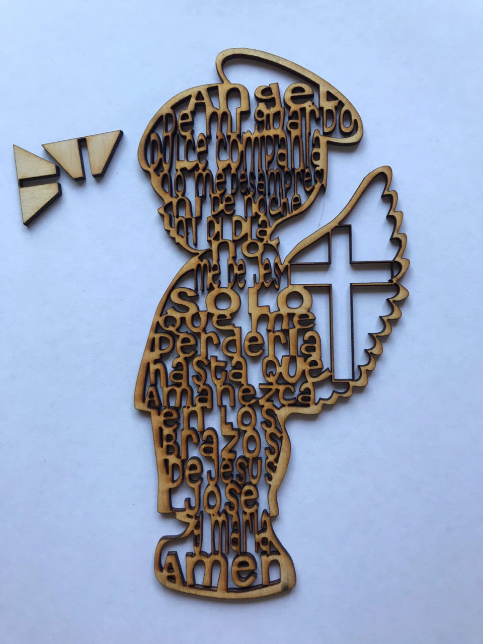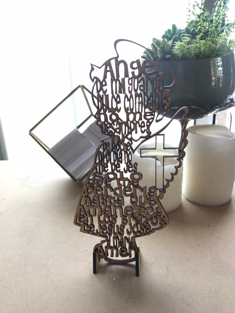 Angel with beautiful Spanish Prayer. Angel may shows some burn marks on back from laser cutting, it gives a nice rustic look!