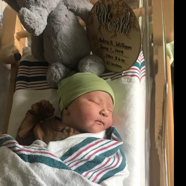 Introduce your newborn in style with our Hello Baby Birth Detail Hospital Sign—a beautifully laser‑cut, 8″ round wooden plaque designed to showcase your baby’s arrival details. Personalized with “Hello Baby” greeting and optional decorative vine leaves, this plaque features spaces to hand‑write your baby’s name, date of birth, time, weight, and length using pen or pencil. It's crafted from 1/8″ birch wood, raw finish, perfect as a hospital photo prop or keepsake display.