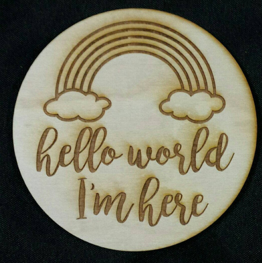 Hello World I'm Here Rainbow Announcement Plaque Laser Cut Wood Photo Prop Sign