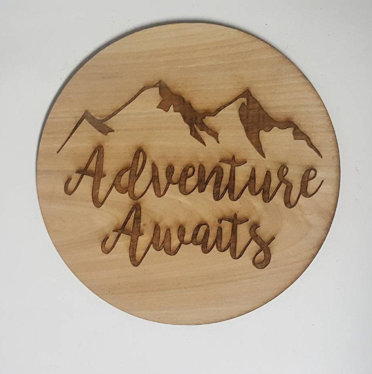 Mountain Adventure Awaits Outdoor Lover Baby or Wedding Announcement Plaque Laser Cut Wood Photo