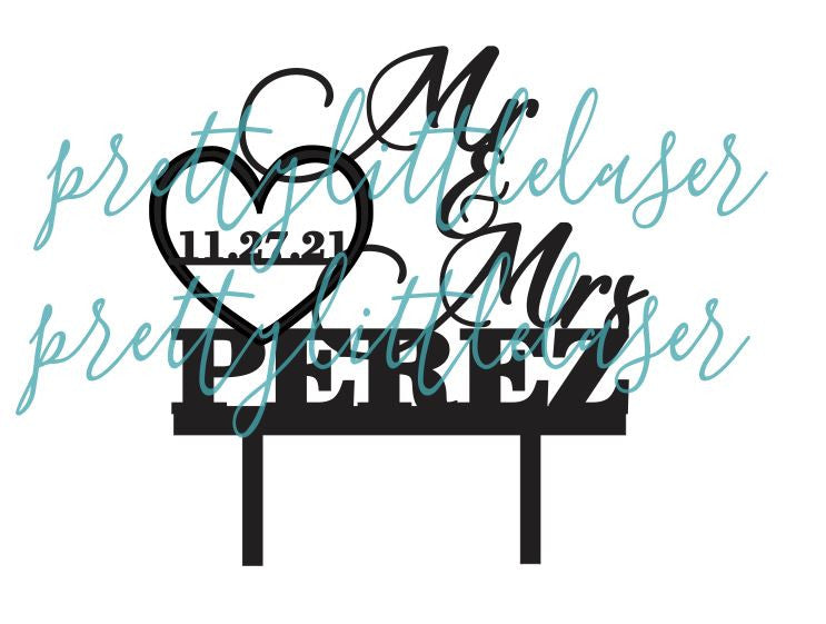 Mr and Mrs Personalized with Last Name and Date in Heart Cake Topper