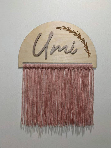 Custom Macramé Wall Hanging with Wood Circle Name or Word Wall Nursery Room Office Living Room Boho Chic Bohemian Decor Wooden Wall Art