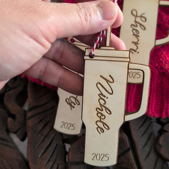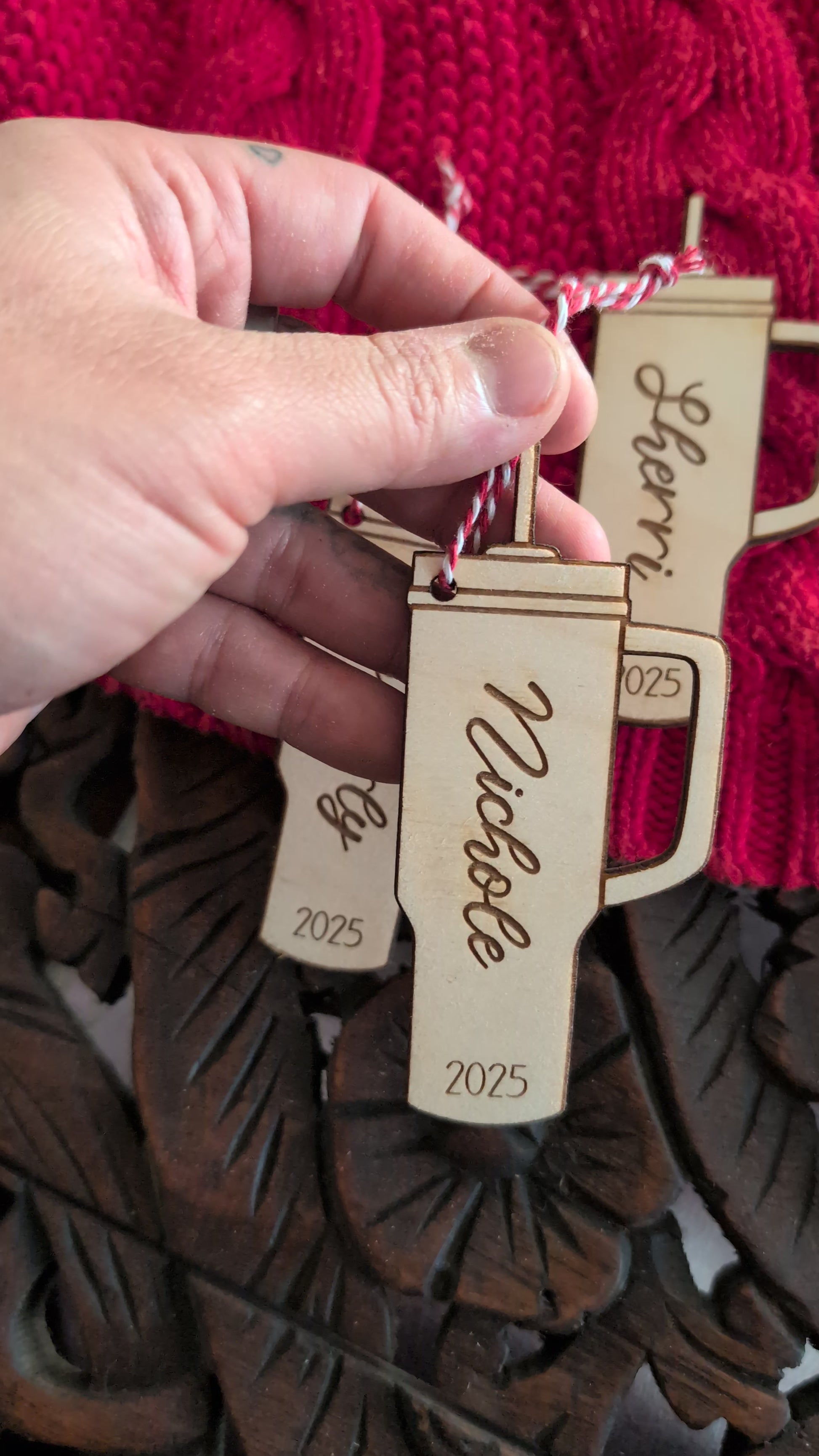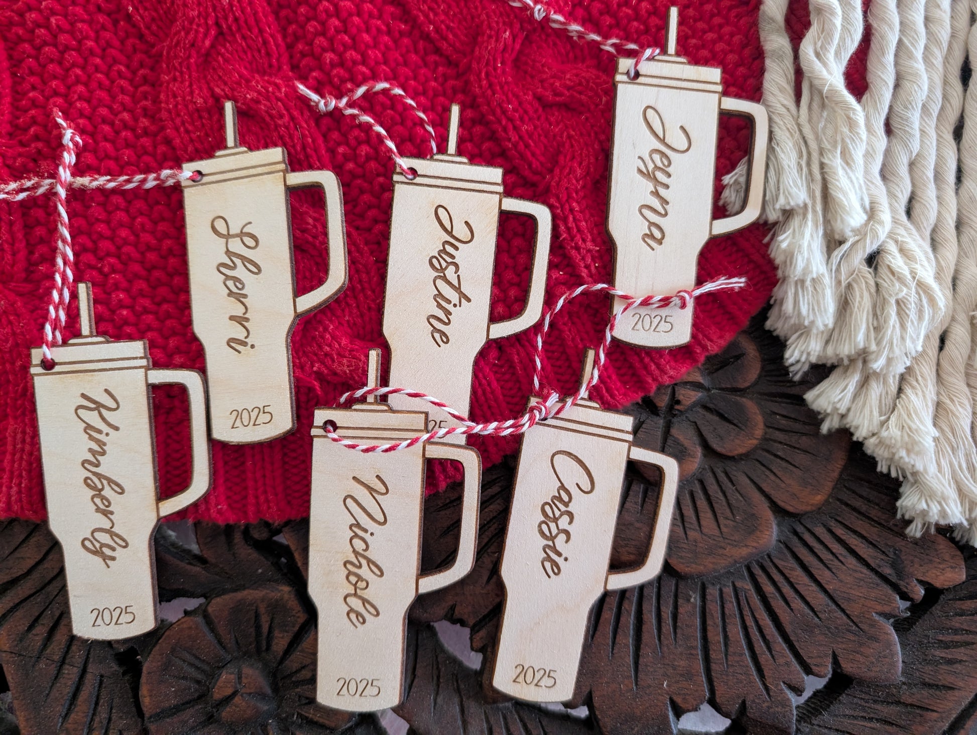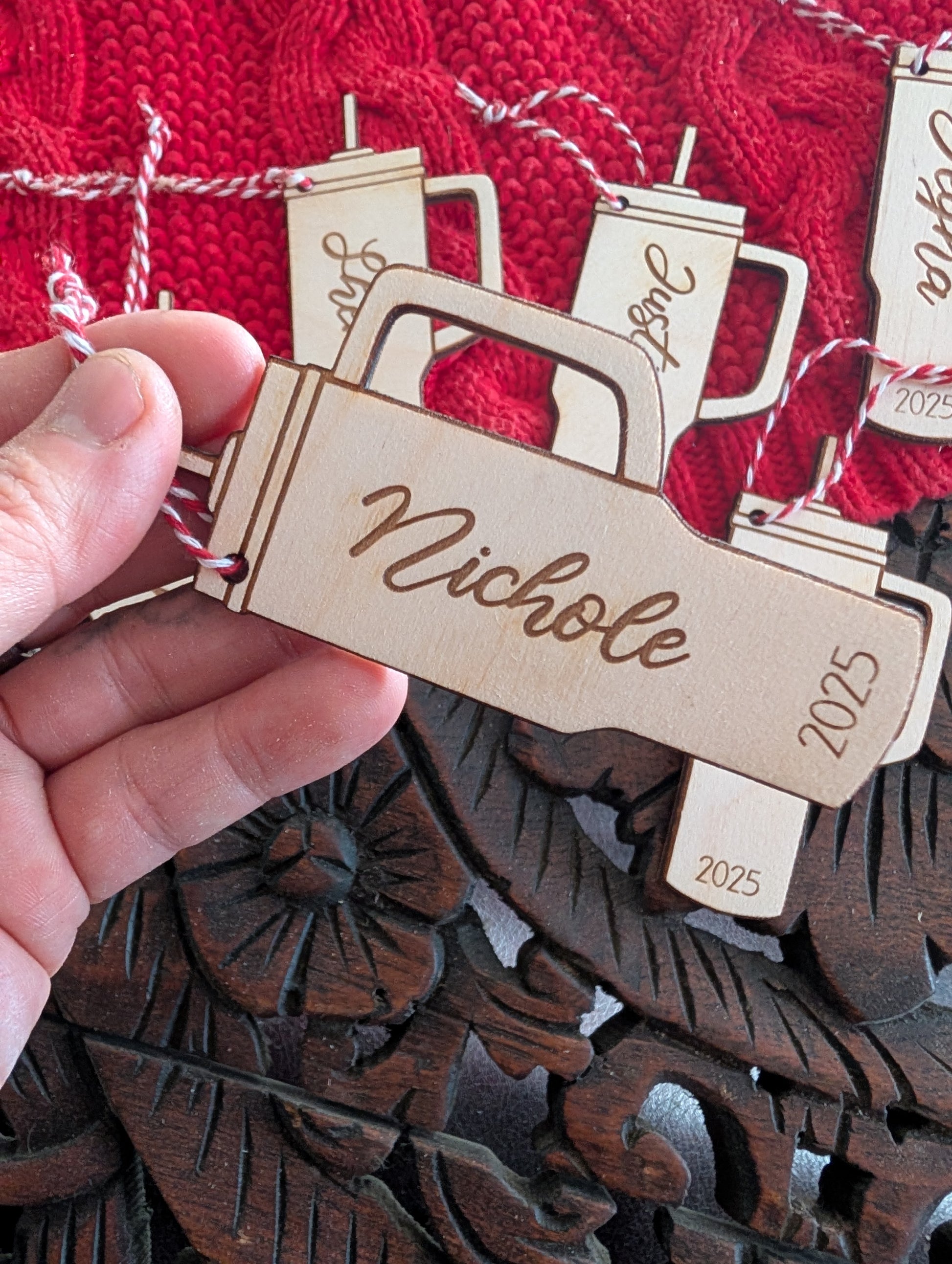 Each ornament is laser-cut & engraved in-studio at La Paz Design Studio and features your choice of name personalization. Designed with premium materials, clean detail, and a fun mini-tumbler look that makes everyone smile.