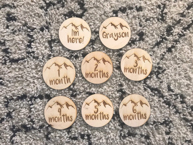 Mountain Themed Baby Monthly Milestone Plaques with Name and I'm here!